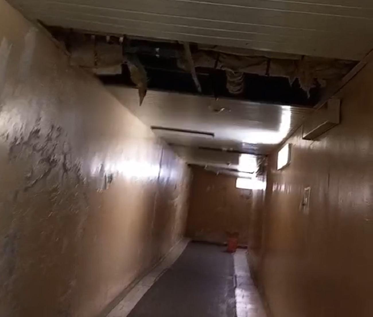 Видео демонстрирует катастрофическое состояние коридора, больше похожее на кадры из фильма ужасов.