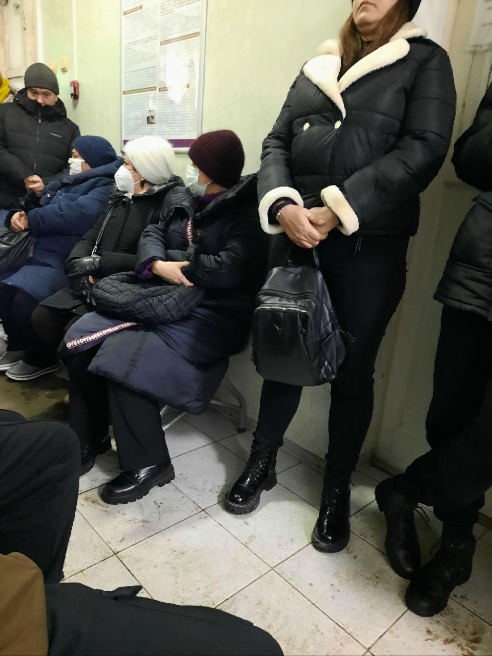 На присланном фотографическом снимке видно, что все места в коридоре заняты, многие ждут стоя. При этом, как уточняют ожидающие, в кабинет врача пускают только одного человека в час.