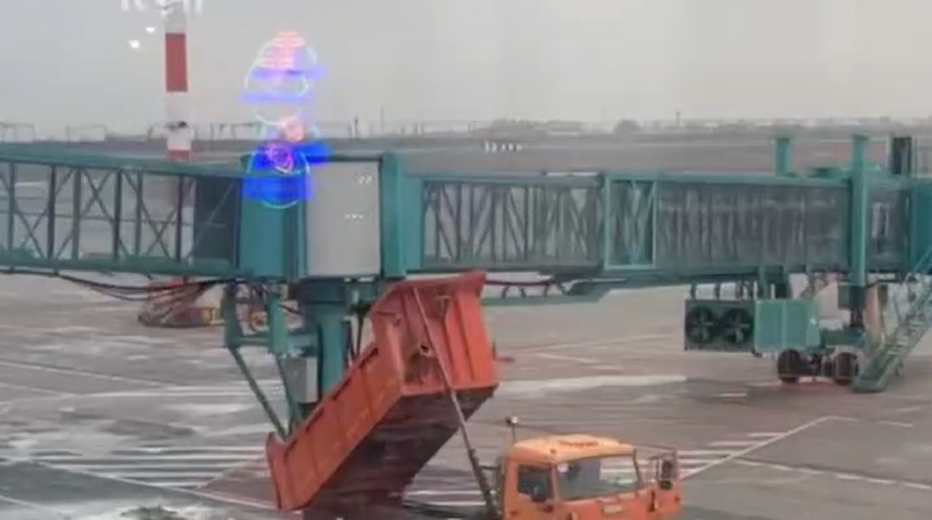 Очевидцы засняли на видео последствия наезда грузовика на пассажирский трап в международном аэропорту Волгограда. Момент столкновения в кадр не попал, однако хорошо заметны повреждения нижней части конструкции.