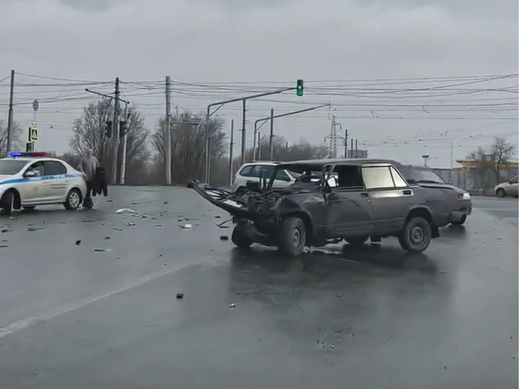 На оживленном перекрестке в Волжском произошло серьезное столкновение, в результате которого легковой автомобиль был разорван на части.
