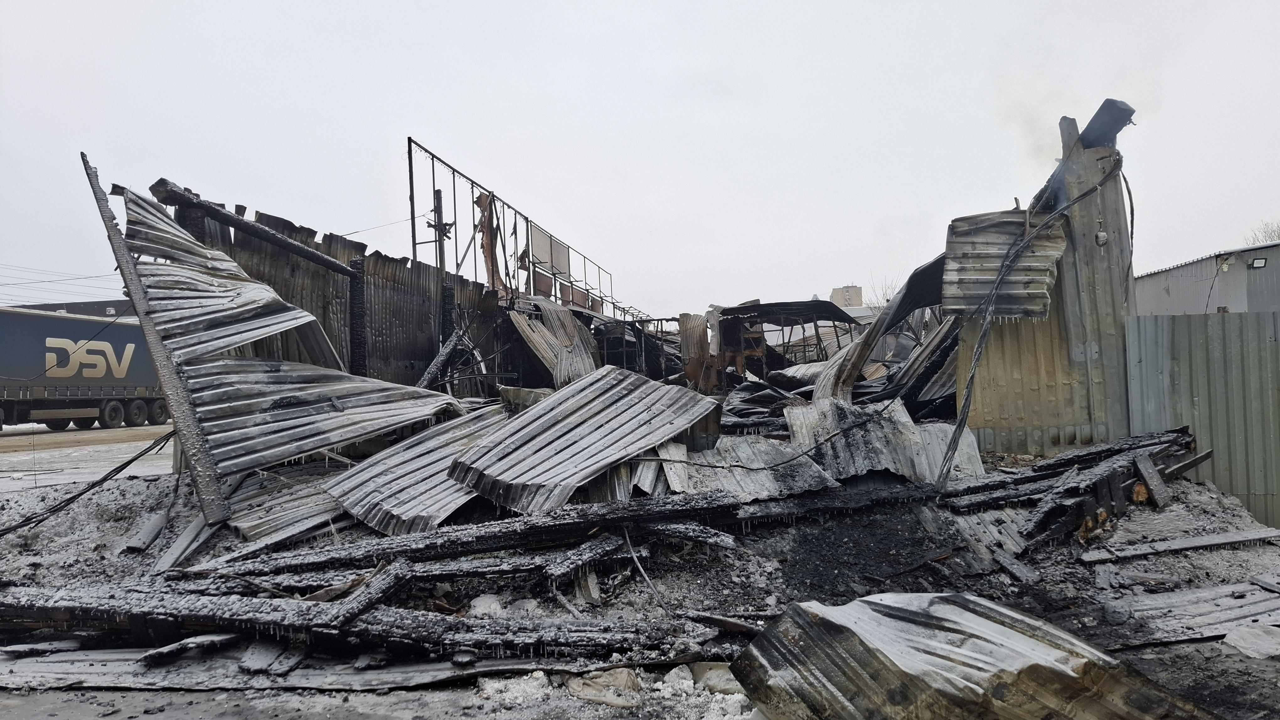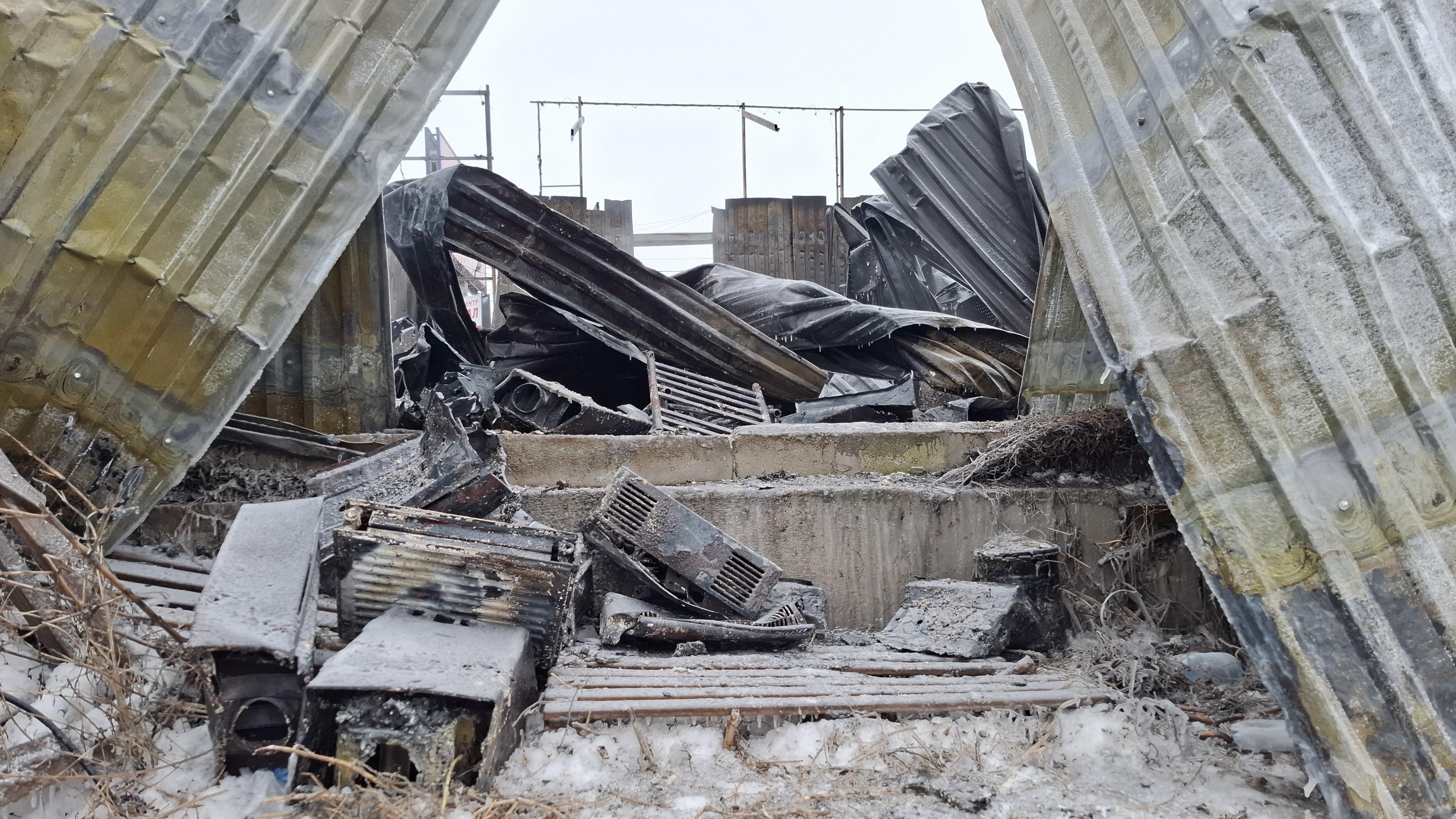 Внешне конструкция склада выглядит целой, но внутри все повреждено огнем и водой.
