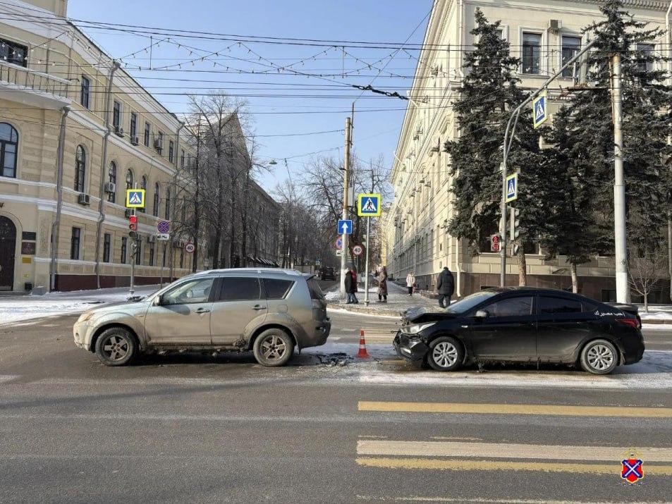 На перекрестке проспекта и улицы Ленина в центре Волгограда столкнулись кроссовер Mitsubishi Outlander и седан Hyundai Solaris. В результате аварии пострадала женщина-пассажир.