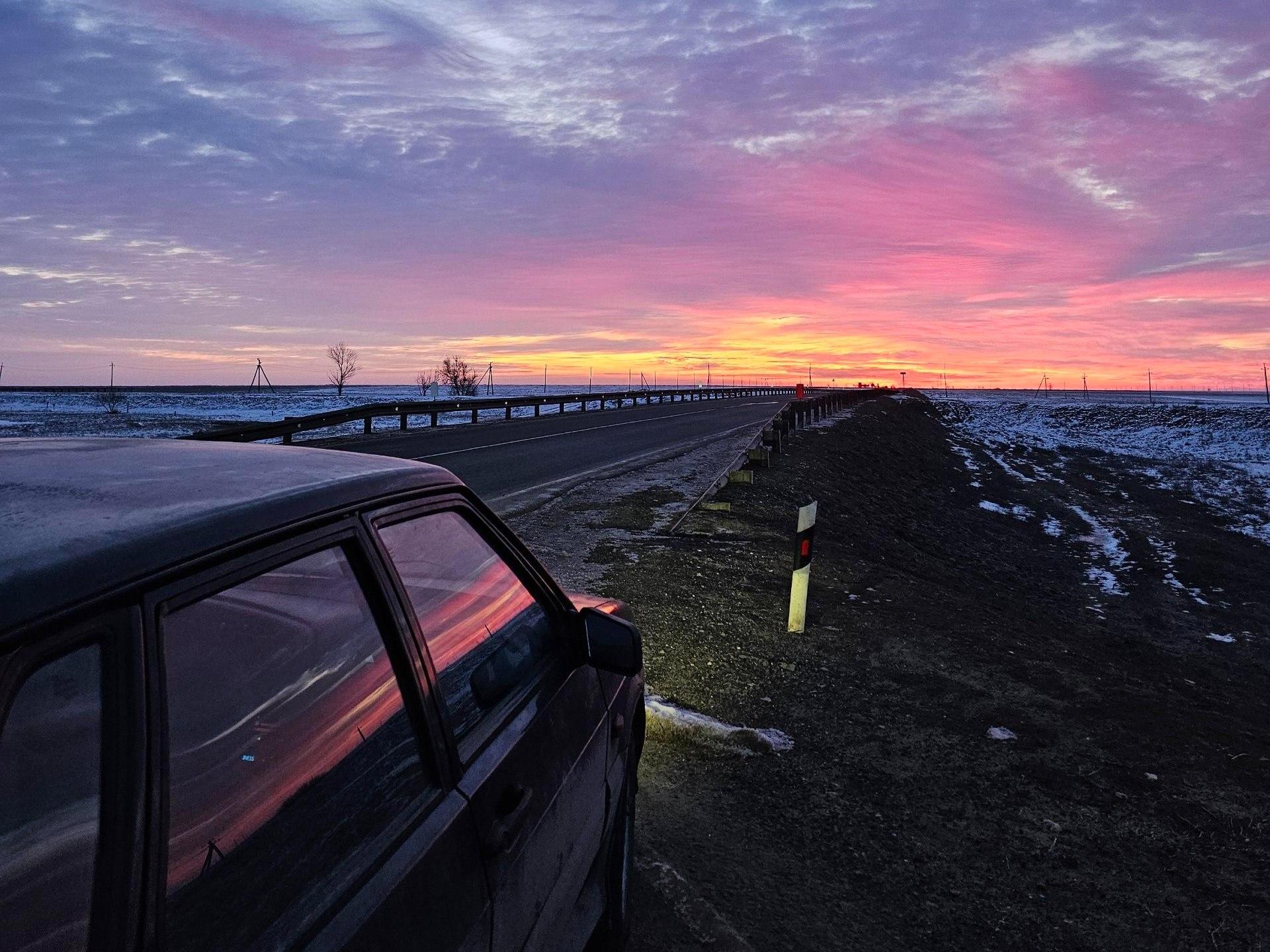 Алые закатные тона были запечатлены на трассе Е-119 во время поездки из Астраханской области.