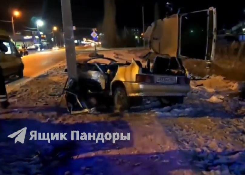 Происшествие случилось около торгового центра «Добрострой» в Волжском приблизительно в 20:40. На первых видеокадрах виден результат столкновения: Лада ударилась в столб передней левой частью, что привело к повреждению всего автомобиля. Левая сторона оказалась полностью смятой, включая заднее колесо, а крышу, судя по всему, срезали для доступа к водителю.