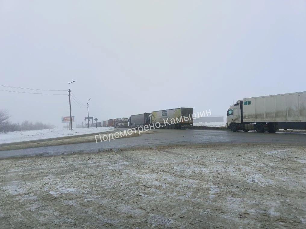 Очевидцы из Камышина сообщают о значительном скоплении грузовых автомобилей на федеральной трассе Р-228. Из-за введенных ограничений фуры выстроились в длинную колонну, уходящую в туман.