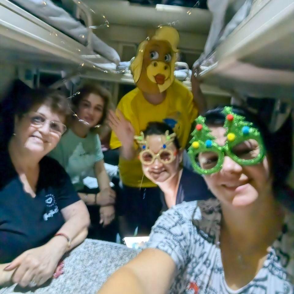 — Поднимали настроение как могли. У нас были и елки, и гирлянды, и «лошади», и музыка новогодняя… мы хоть и опоздали, но до Нового года успели приехать. В 20:45 въехали в город, а в номер заехали в 23:48, как раз к речи президента.