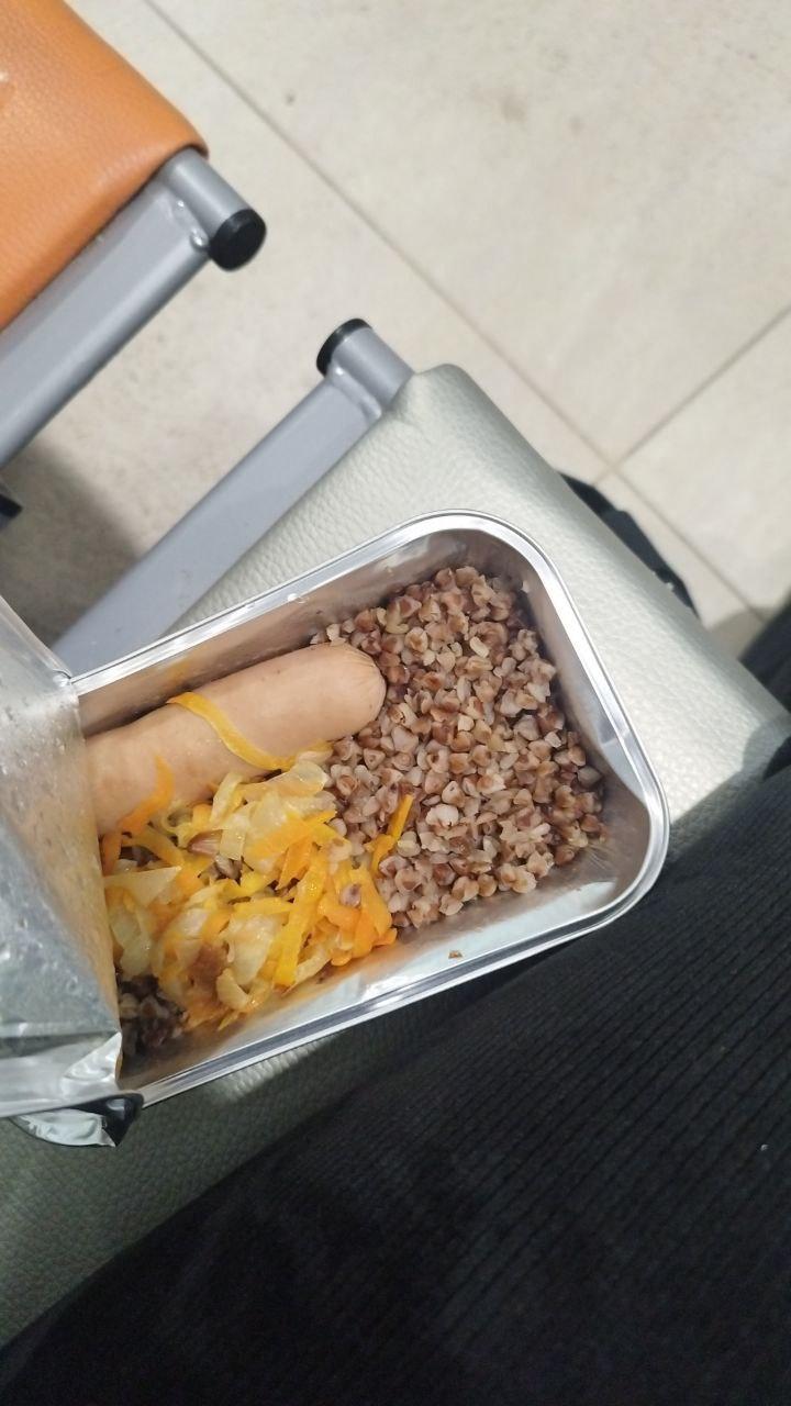 В качестве горячего питания при задержке пассажирам предложили гречку с сосиской в керамической посуде.