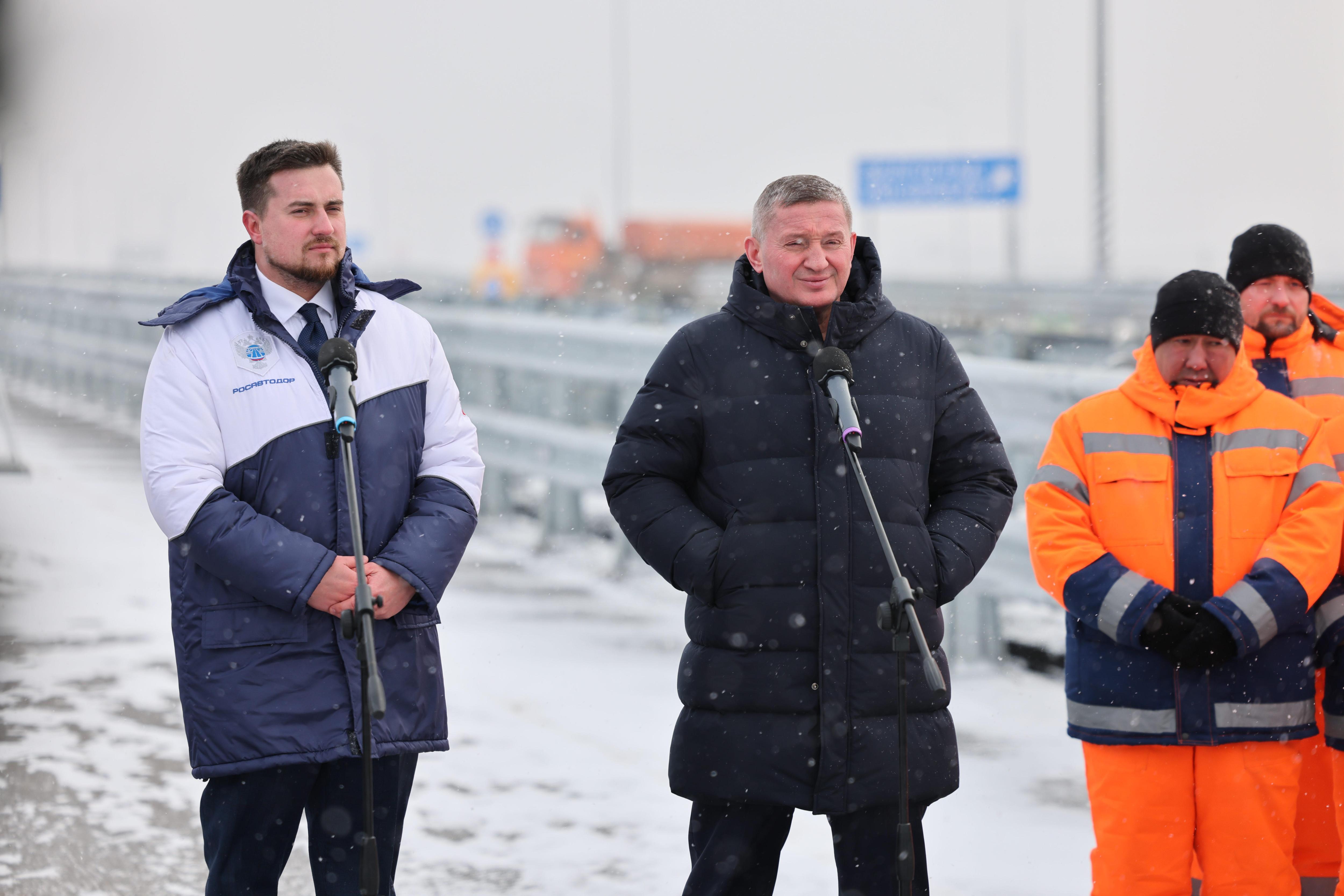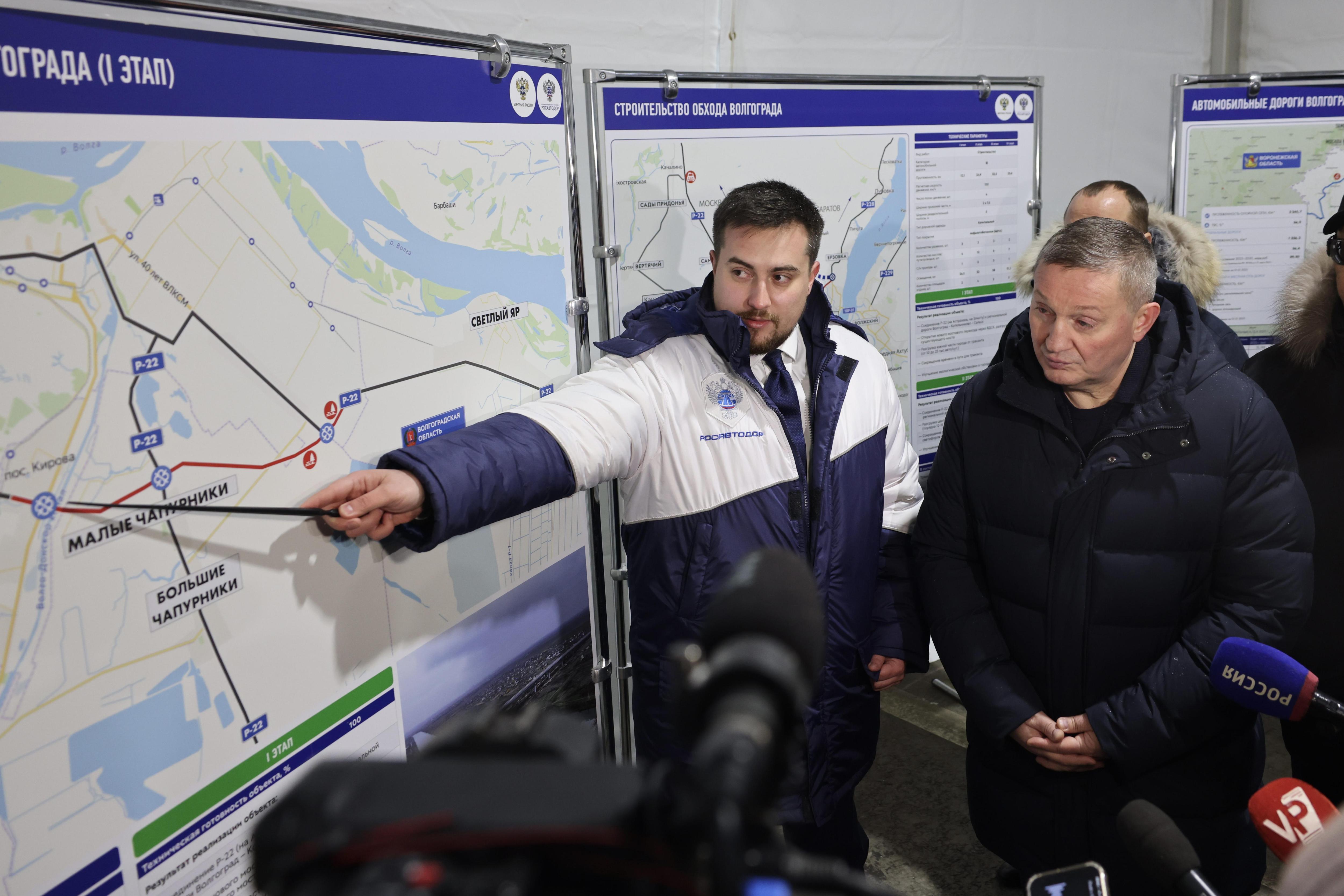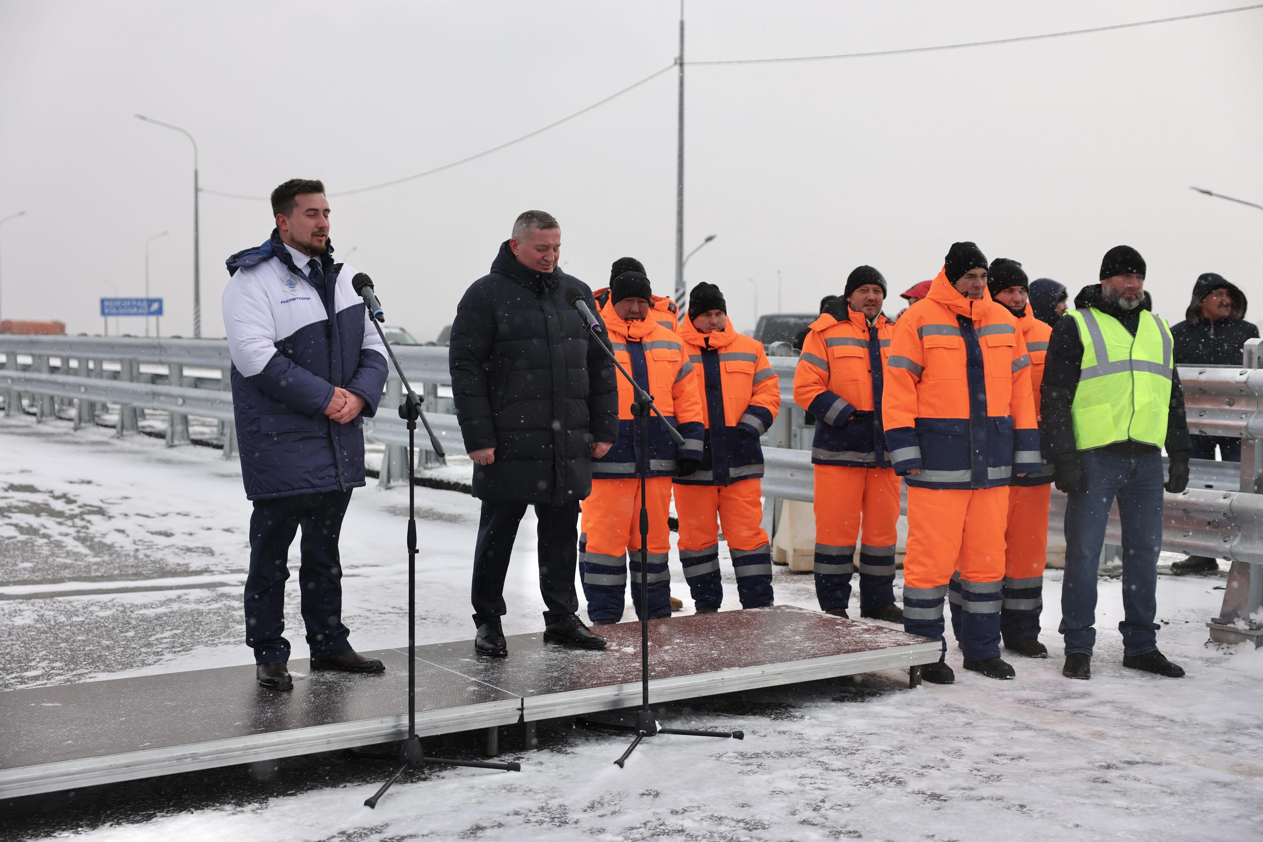 Губернатор Андрей Бочаров, управляя комбинированной дорожной машиной на базе КАМАЗа, первым проехал по новой трассе, ознаменовав завершение многолетнего строительства 12-километрового участка сигналом клаксона. Этот отрезок войдёт в состав федеральной трассы Р-22 «Каспий», являющейся ключевой артерией маршрута «Север — Юг» и обеспечивающей выход к портам Каспийского моря.
