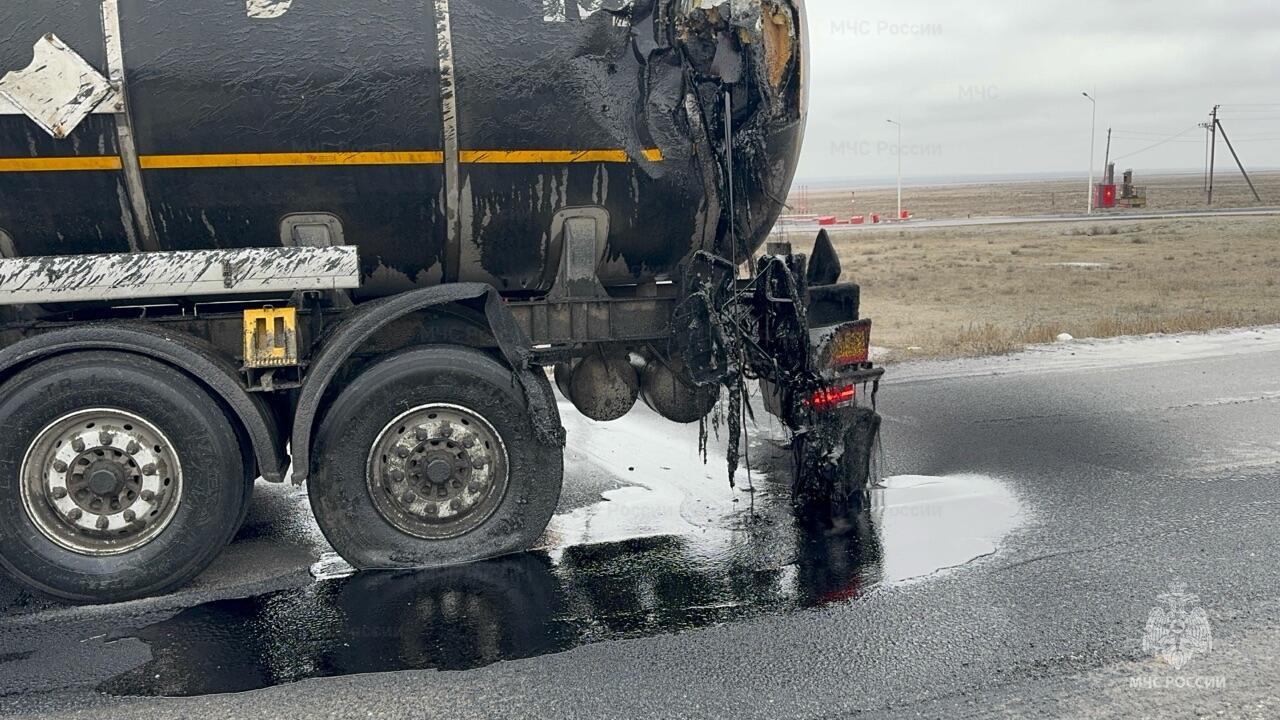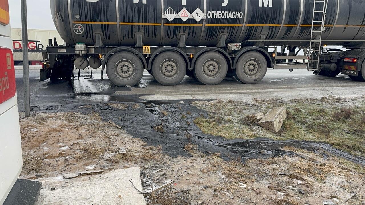 Утечка горячего битума произошла после столкновения двух грузовиков на трассе под Элистой.