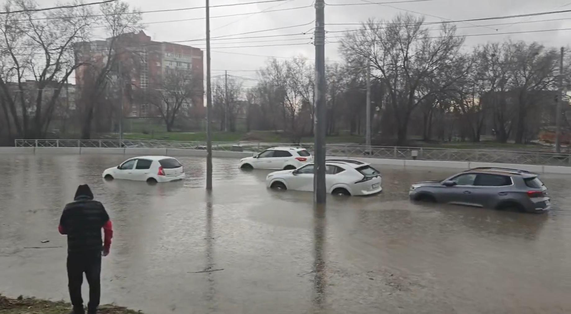Уровень воды на улице Голубинской поднялся настолько высоко, что превысил пороги кроссоверов. Движение трамваев через этот участок временно приостановлено.