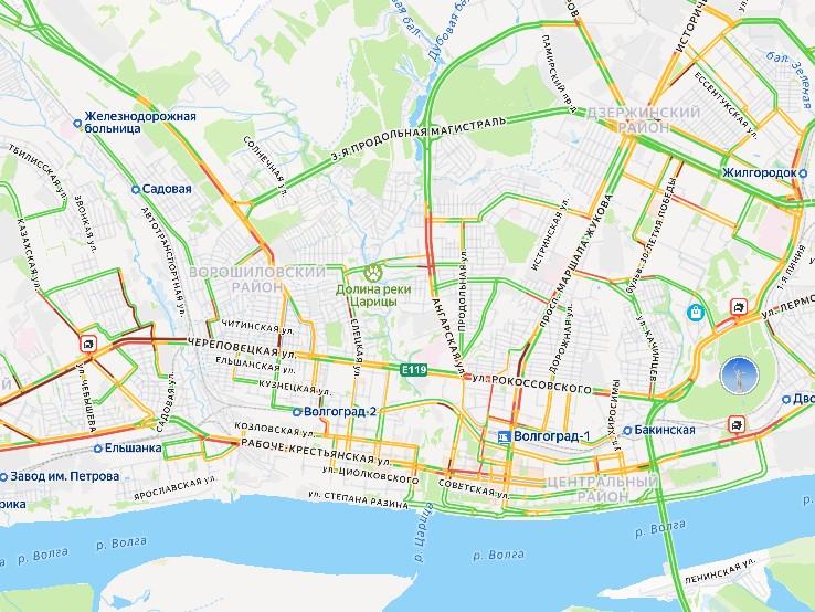 Утренний снегопад привел к масштабным пробкам на дорогах Волгограда. По данным сервиса «Яндекс Карты», уровень заторов достиг максимальной отметки в 10 баллов.