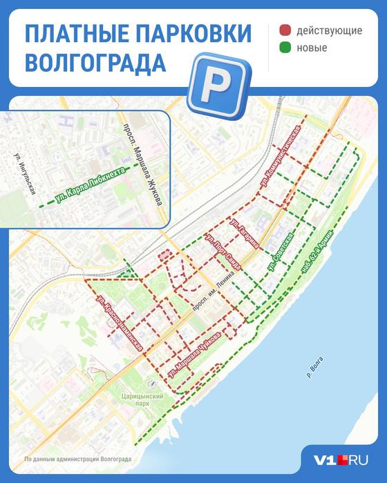 Новые платные парковки появятся на следующих участках центральных улиц Волгограда: