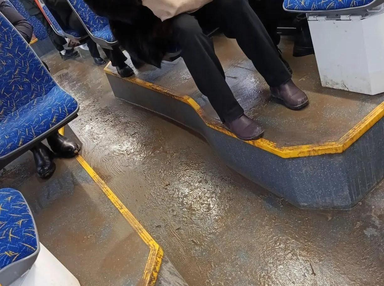 На фотографиях, опубликованных горожанами, действительно заметен значительный слой жидкой грязи на полу. Однако оценить влажность сидений по снимкам невозможно, а точная дата и время съемки не указаны.