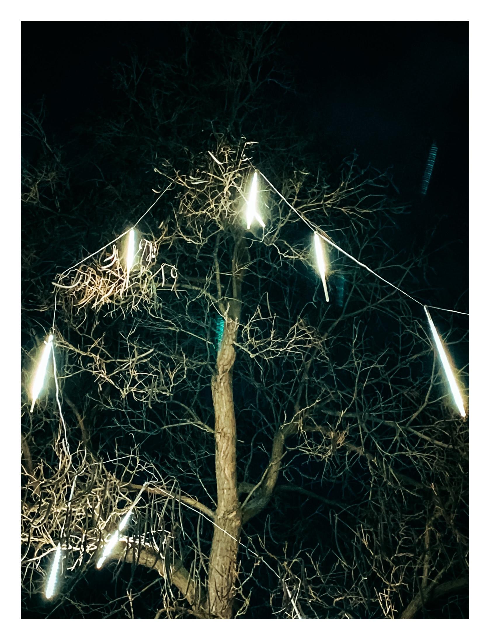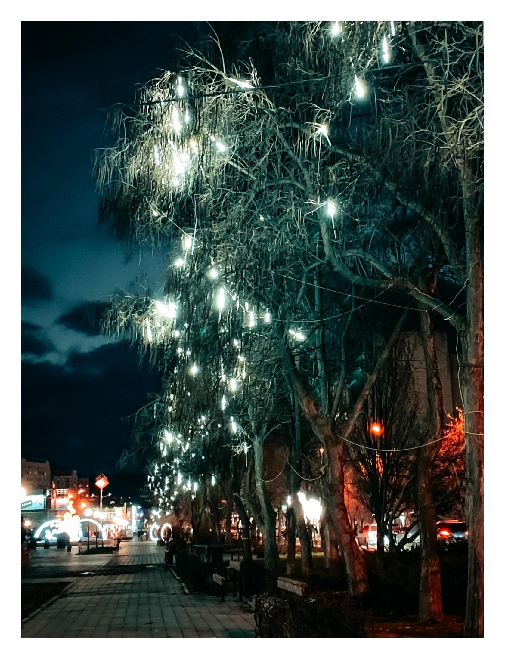 Огни городской иллюминации смешиваются с новогодними гирляндами.